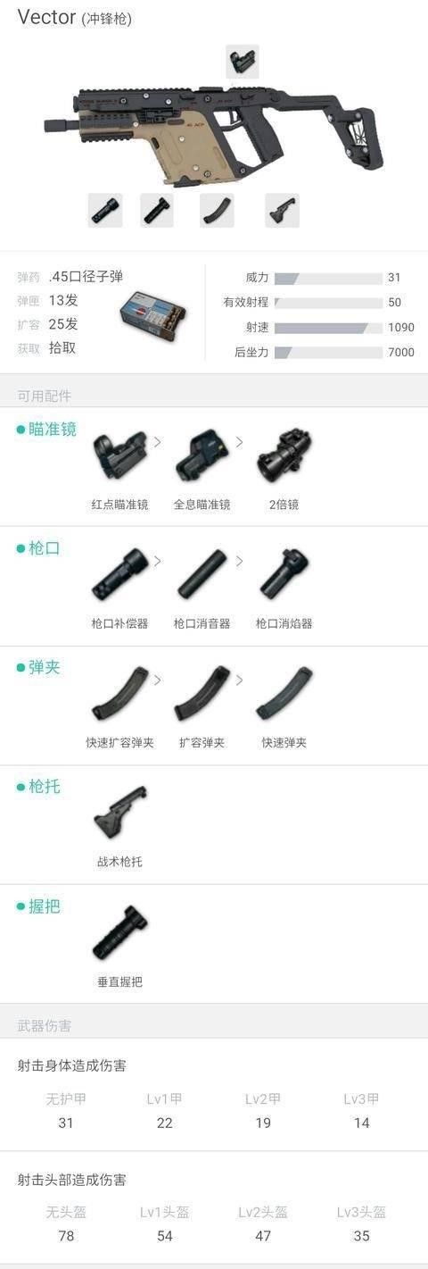 射速为全冲锋枪中最慢的,因此秒伤并不高,做近战武器其实非常勉强。加上无法安装瞄具以及枪口只能装消音,它的实战范围非常有限。这把枪的主要适用面还是在于四排中安排一人持枪扫车,其他作战环境相对较为难用。