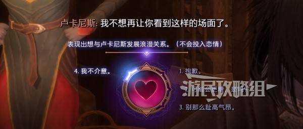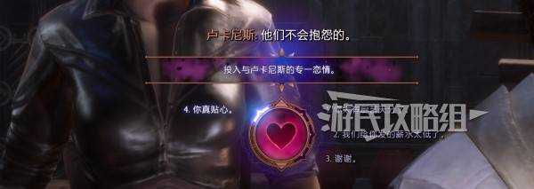 与想要发展恋爱关系的角色调情。每隔一段时间就有机会选择带有爱心符号的对话选项来发展恋爱关系,在灯塔的单人对话以及任务期间对话选项都会出现。不过要注意,在阵营/区域任务,或者是同伴任务期间,可能会有如下图所示带有【(不会投入恋情)】的提示的选项,这里指的是,此时选择爱心选项可以与当前对话的角色调情,但不会确立恋情,可以放心选。如果是确立恋情的重要选项,也会显示关于确立恋情的提示(在确立恋情时如果选择不与该角色发展浪漫关系,之后将无法确立恋情,该角色可能会与其他同伴发展恋爱关系)。