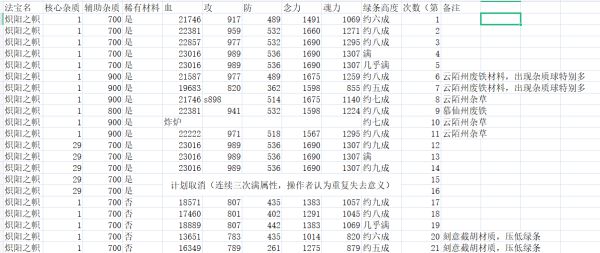 除了材料收集之外,最最最最最重要的就是杂质含量了,杂质含量和炼器资质一定程度上影响了最终器型品质,你的法宝什么属性,全取决于这玩意。下面附一张SL重复试验记录表格。