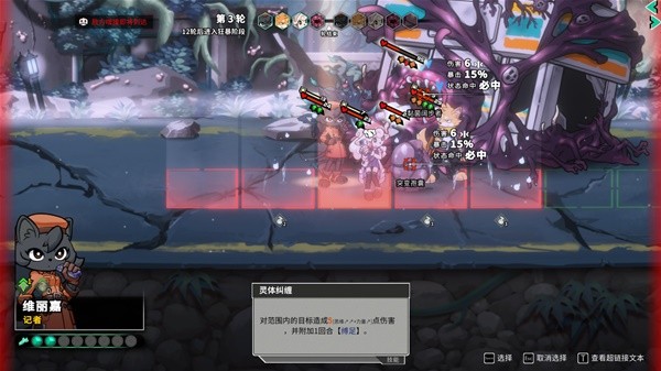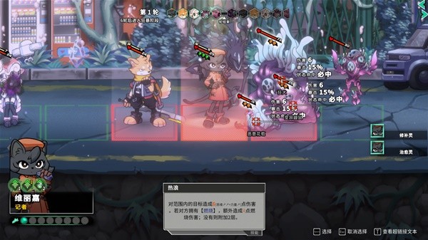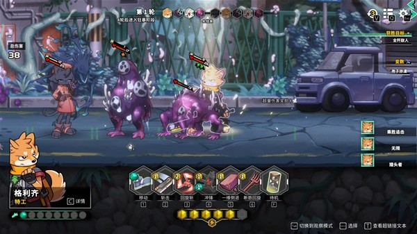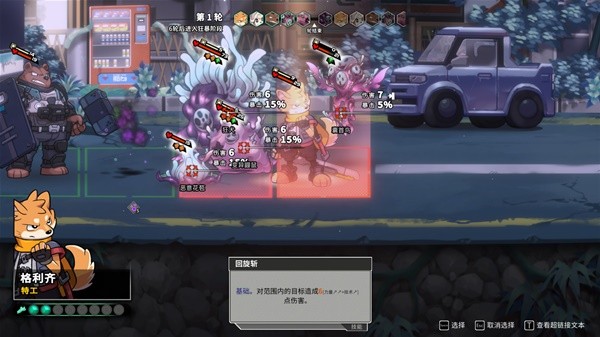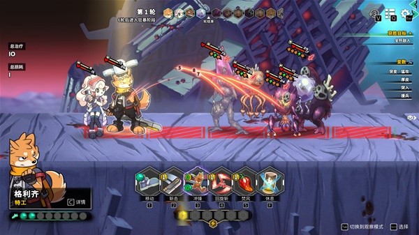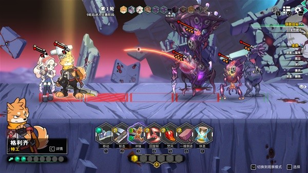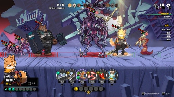 以下图为例,敌人和我方的血量差距巨大,不过基本敌人的攻击是有“弹道”而非“锁头”,给了操作的可能性——我们的特工狐狸可以移动到它身后,兔子医师则可以后撤一步,就能避开攻击。在《异界失控》中,不存在传统xcom式游戏的“攻击后结束回合”设定,所以可以达成非常自己的操作顺序,这一方面增加了容错率;另一方面和共容易达成和队友的配对合击。