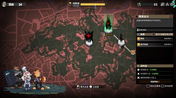 值得一提的有两点:第一就是“时间就是金钱”,除了关底和队友,其他的事件都有存在事件,慢了就会消失——这带来的问题是一些困难的取舍,比如马上要消失的精英,但是你只有两个队员,去打可能团灭;第二是我们可以付出“异变值”也就是敌人的BUFF作为代价带换取问号事件和获得碎片中更高的奖励,但是也要面临不断加码之后,长时间越来越困难的战斗。