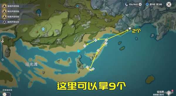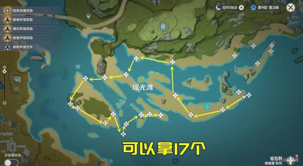 2、回到瑶光滩东边的传送点,向西边走。传送点所在的沙滩西边可以拿3个,然后向北边的沙滩走,沿着海岸转一圈,总共可以拿14个。(共17个)