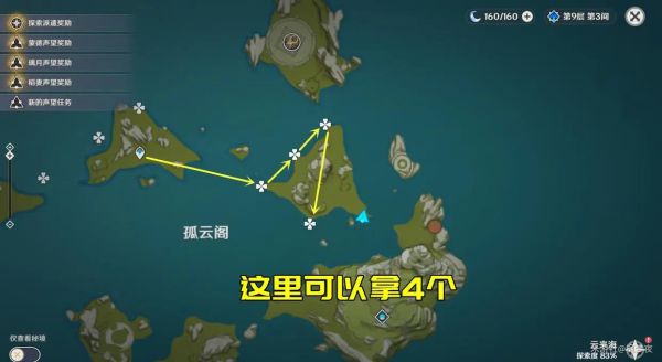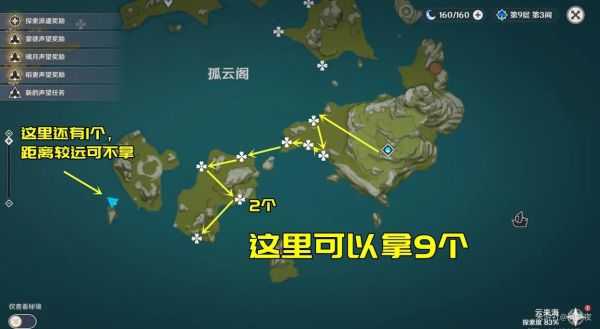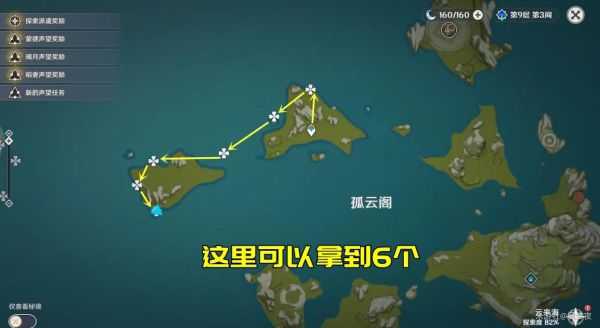 5、孤云阁传送点所在的小岛可以采集2个。然后西边的小岛走,两座小岛连接处的沙滩可以拿到1个,西边小岛可以拿到3个。(共6个)