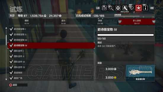 黄金横扫棒蓝图需要我们击杀50只抢宝丧尸,也就是背着背包的新鲜僵尸。而投资试炼需要我们从僵尸身上收集2万个废料,也就是游戏内齿轮形状的金钱。这两个试炼可以同时完成!只需要第二章开头那个场景(喜一郎广场)。