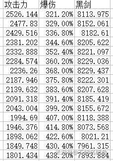 从数据中可以看到爆伤在368%时两把武器面板输出均达到最高值,因黑剑27.6%/3.9%=7.0769...。