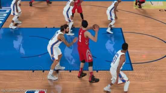 2、使用右摇杆向底线方向推,做出翻身跳投的假动作。或者使用右摇杆向篮筐的右侧推,做出翻身勾手的假动作。