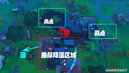 开局降落推荐图中的红色区域,红色区域是大飞虫的头部,这块不大的头部就有五个宝箱的刷新点,相邻不远,降落总能第一时间拿到足够多的资源。然后再选择蓝色箭头敲击木材就直接溜,或者选择红色箭头,继续从建筑最高的翅膀往身体里进攻,最后再清理建筑的周围。