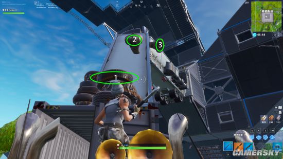 从地面跳到集装箱上,踩着轮胎弹跳到二号的柱体上,再空格跳到三号的柱体,然后就可以到达爪子之上,悄悄的走到最高处哟。