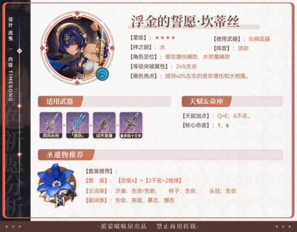 (主要作用是提供40%左右的普攻增伤和水附魔,目前没有非坎蒂丝不可的配队,坎蒂丝的可替代性比较高)