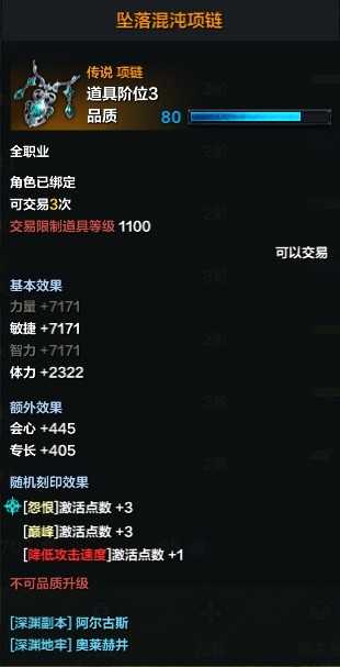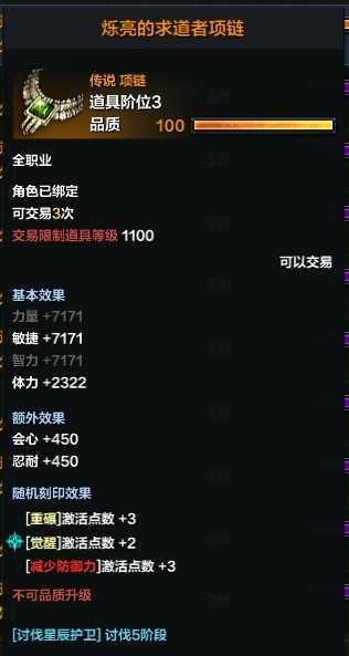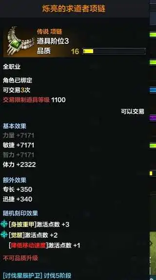 在以这条项链举例子,额外效果是专长,迅捷,属性对了,那就接着看随机刻印,身披重甲3点,觉醒2点,那么这条项链是奶妈需要的,但是因为品质只有16点,并且只是个觉醒2,所以最终价格只有500金。。