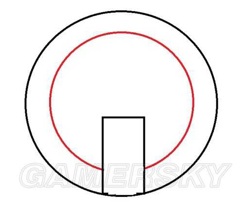 这里放一个地形简化的小图片,开场进去之后不要着急想来一个开门红很容易射偏,进去之后马上往旁边走然后锁定好boss的头部开始绕圈,绕的位置差不多就是上面图的红线的位置,这个位置进退都挺方便的,而且这样boss也会跟着你转这样他出招的次数就不会那么多。