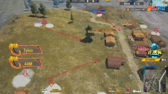 拿职业比赛做一个简单的解析,从图中我们不难发现,在决赛圈的战场中基本每一个存在战队的位置都会有烟雾弹的出现,这不是多余的举动,这是他们为了进圈采取的最佳行动。
