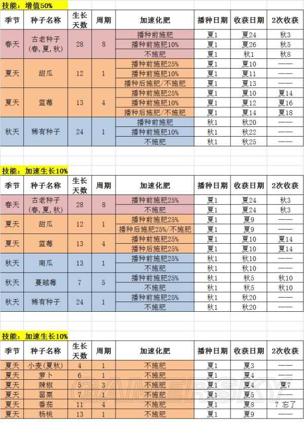 新增测试了在增值技能+25%加速化肥的情况下,夏季作物的生长时间,以及全部测试作物的加速率。