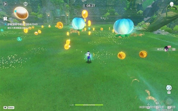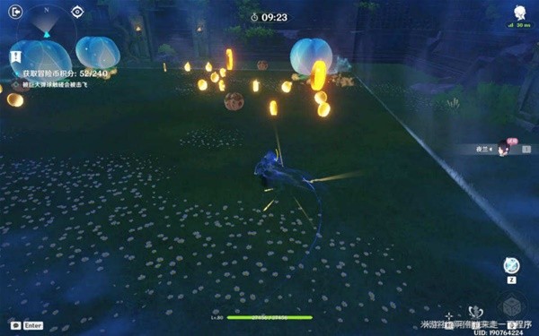 使用神里绫华的天赋技能代替冲刺在水面移动以获取金币。小心脏脏弹,被击中会遮挡视野。没体力了可以通过获取场上的光点来恢复。
