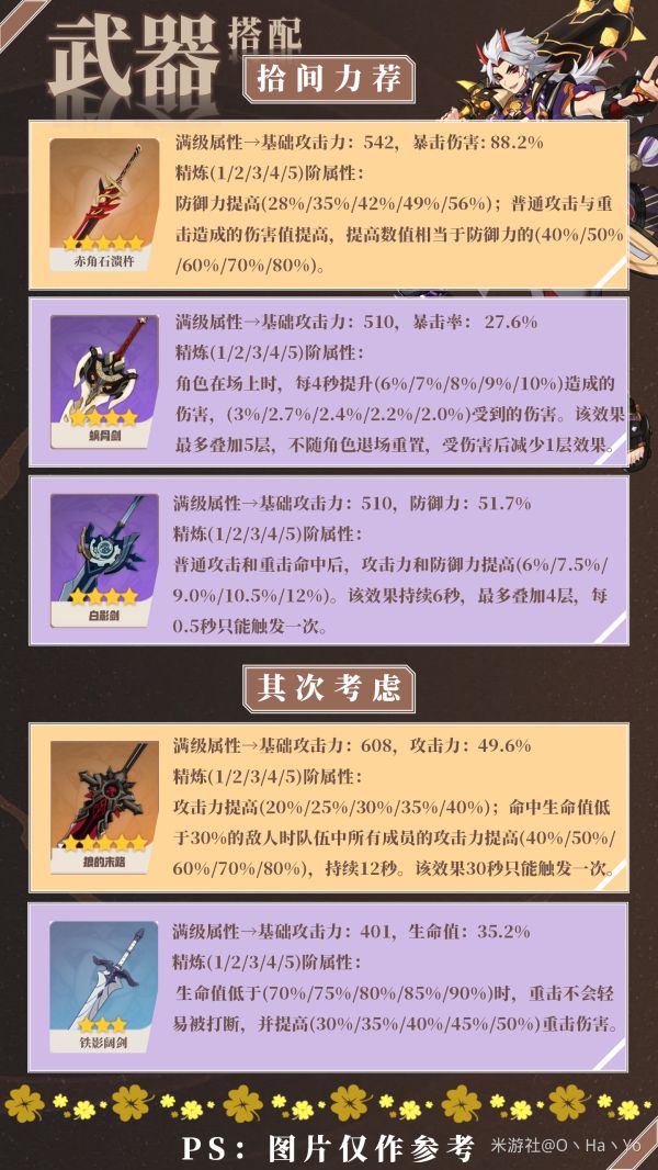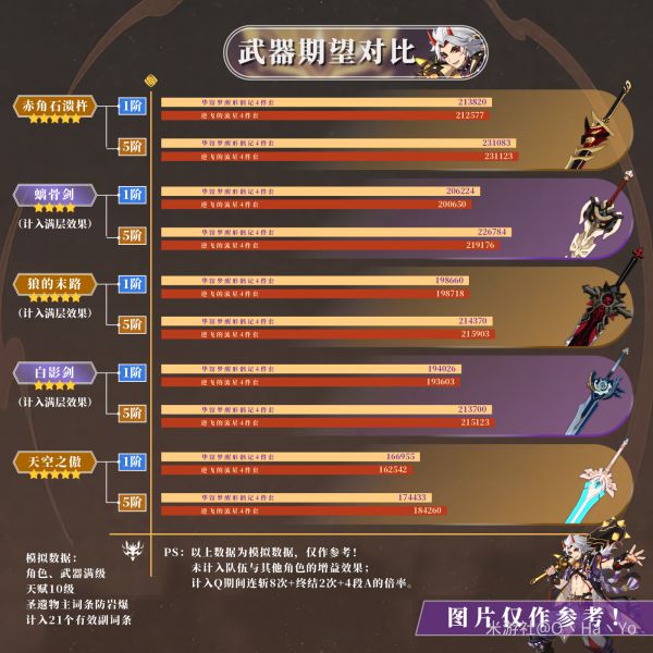 PS:上图仅供参考!因只计入一斗单人时除自身以外无其他任何增益状态的数据,比如满阶白影剑在防御力这一属性已经饱和几近稀释的状态下,逆飞的流星4件套提供的伤害加成效果明显是优于华馆梦醒形骸记4件套,但如果加入双岩共鸣和五郎的岩伤加成反而会被4华馆超越!同理于满阶赤角,以及满阶赤角与满阶螭骨剑的对比相差不大,都是同样的道理。