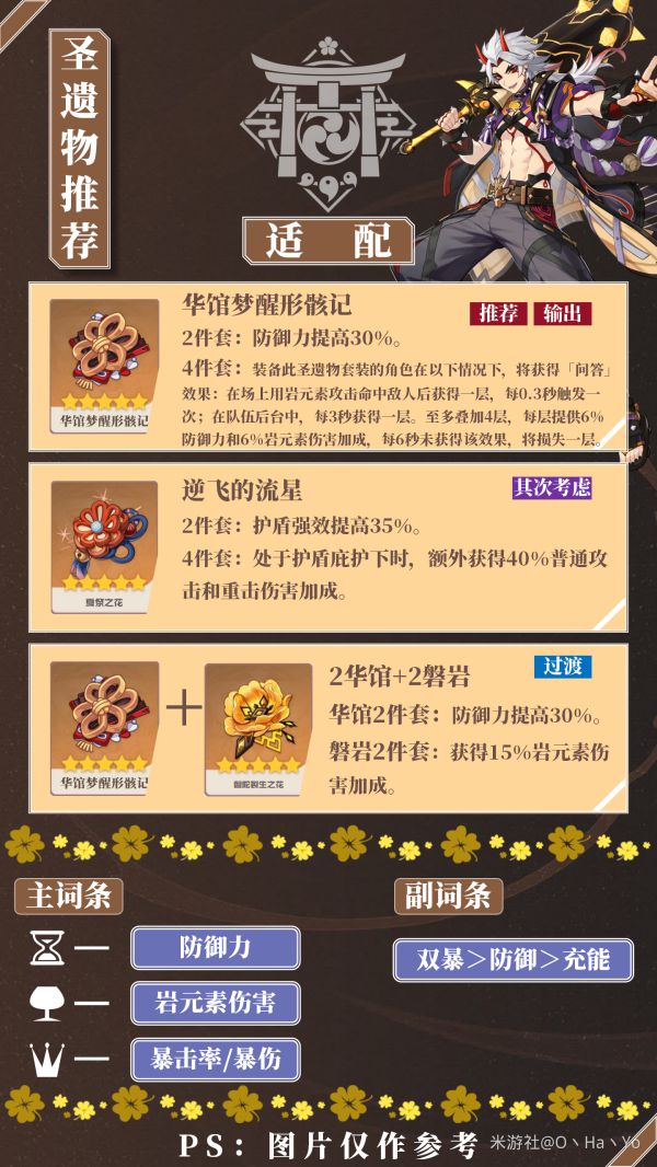 最适合一斗的圣遗物就是华馆4件套。虽然一斗开Q防御力转换攻击力时会锁防御力面板,而基本日常使用中开Q时基本都只有1层问答效果,但是后续的岩伤加成并不会被锁面板,所以一斗佩戴华馆4件套后开Q是越打越厉害。