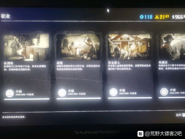 四个职业究竟先开哪个职业争论较多。这里我说一下个人观点。首先四个职业先排除掉私酒贩,25金条的高额解锁明显就是让你最后一个解锁它。其次是商贩职业也排除掉,一个人肝商贩那绝对是要耗费时间非常长而且前期收益还很差的。最后的话,大部分人都纠结于赏金猎人和收藏家这两个职业。我个人最推荐赏金猎人,虽然收藏家单人寻找藏品的美元收益很高,但是赏金猎人的金条收益是所有职业都比不上的。而金条赚取的多少决定了你下一个职业是否能早点开。所以个人观点更建议先开赏金猎人。