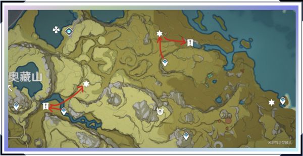 圣遗物材料皆为调查所得,刷新时间分为24小时刷新和12小时刷新,已分别用不同标记区分(旗号标记为24小时,星号标记为12小时,雪山地带暂未考证12小时但不排除可能)