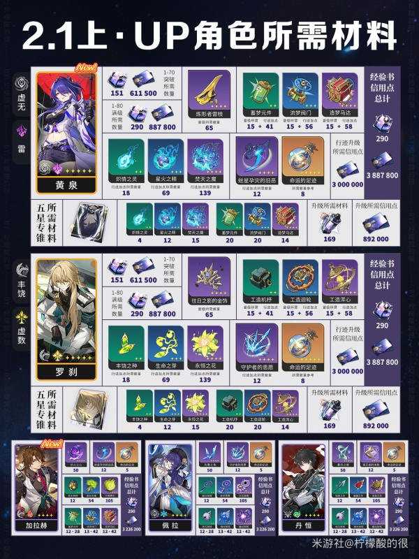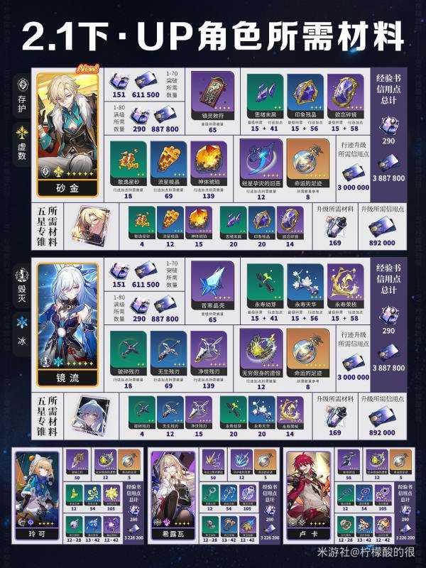 《崩坏星穹铁道》2.1版本即将上线,大家是想抽黄泉还是想抽砂金呢?不知道大家的养成材料有没有准备好呢?迷茫的小伙伴看这里!下面是由“柠檬酸的很”为大家带来的《崩坏星穹铁道》2.1版全角色材料需求表,希望可以帮助到大家。