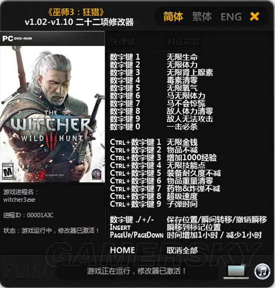 简体、繁体、English,可以切换语言(切换语言后修改器将把该语言设置为默认语言)