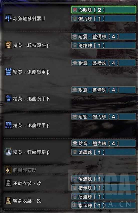 用冰鱼龙轻弩首先可以贴皮,可以客制4次属性异常,然后这把轻弩打冰速射十分优秀,换个配装就能上岗了。但是我们是来聚魔睡觉的,不是来输出的。技能方面就很自由了,迅龙三件真节弹,睡眠4级,剩下的就可以自己随意配了。至于金火4件简单做了下测试,效果不太理想,首先要发动就需要打出会心,那么配装上还要去堆会心,节弹也只能靠护石,效果上也没有拉开很大差距,所以就不做考虑了。