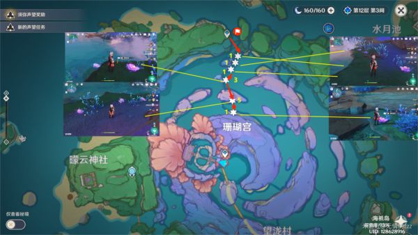珊瑚宫东南部,整体的分布较为分散,但是也并不是完全不方便,我们还是可以沿着一定的路线进行采集,不过最后的一块区域,需要我们完成指定任务以后,才会解锁