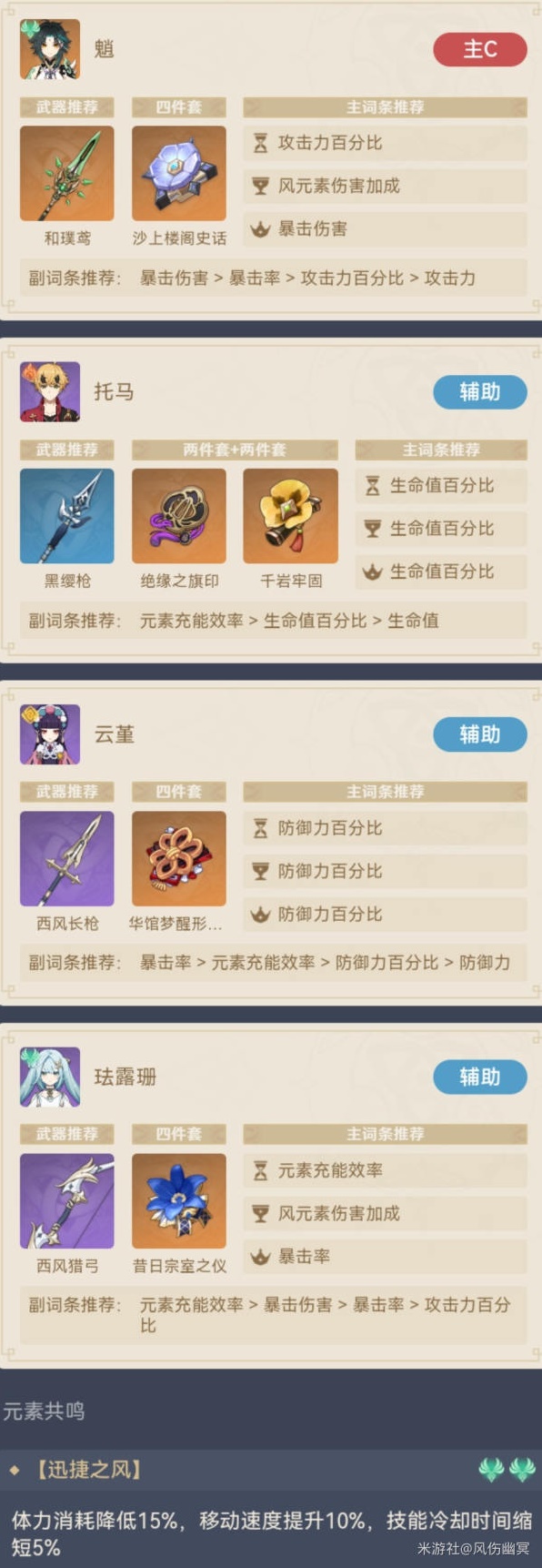 珐露珊大招减风抗、增风伤,宗室进一步加强攻击力,西风替魈和自己充能,满命还能有个小聚怪和风爆加成,而且满命可戴千岩套,增加攻击力同时也提一提护盾。