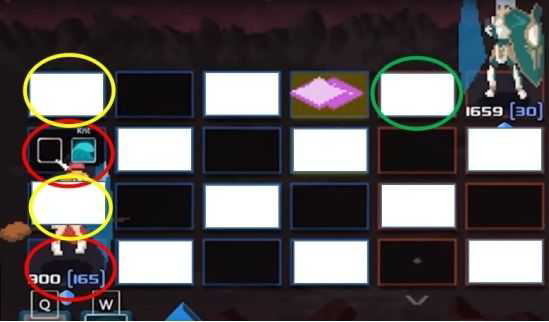由于盾娘大部分招数在板底(最左侧)躲避反应时间更长,因此如果机体允许建议新手在这一列进行移动躲避。我也以此为基础说明。绿色圈中的是攻击的生成块,注意是在boss面前一格而不是boss脚下,因此我们应该保持和boss脚底同色(图里我方和盾娘脚下均为黑)。盾娘基本上只会在最左侧两列进行攻击。当她站在最左列进行全部斜向攻击时,黄色圈为安全位置。如果在第二列则是红圈为安全。夹杂了直线型攻击时自行去掉与boss通行的即可。最后如果从斜线攻击安全区进行紧急回避,就以两格为单位,不要多也不要少。