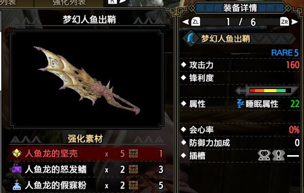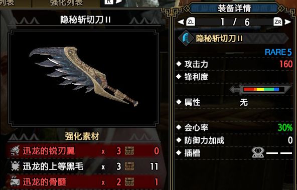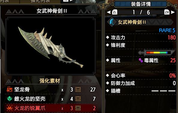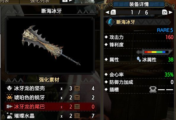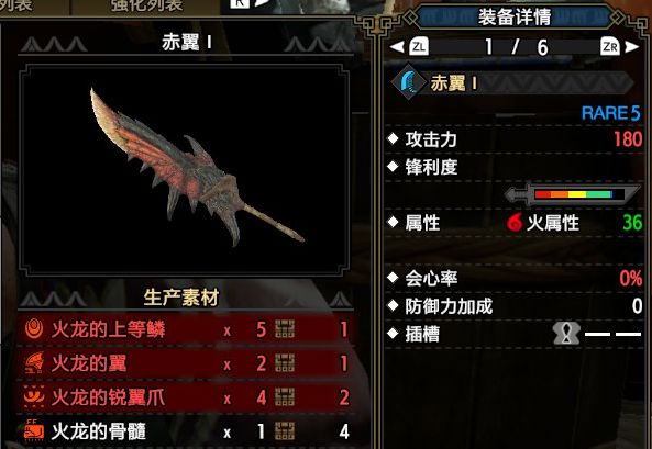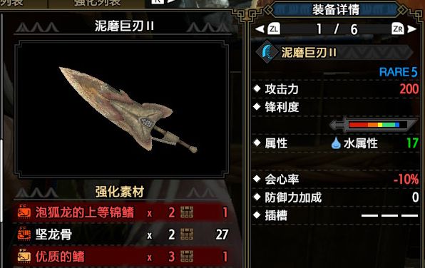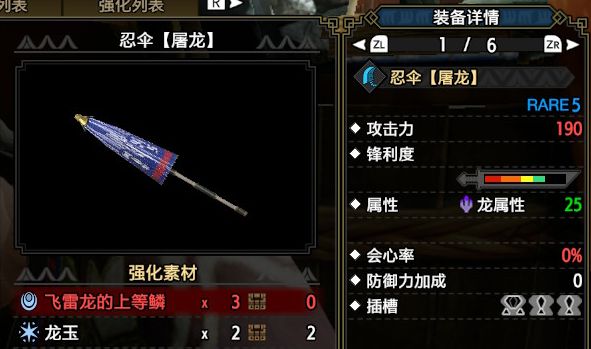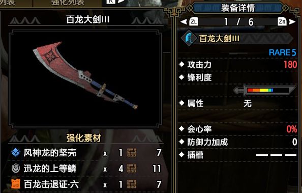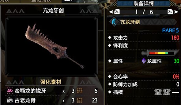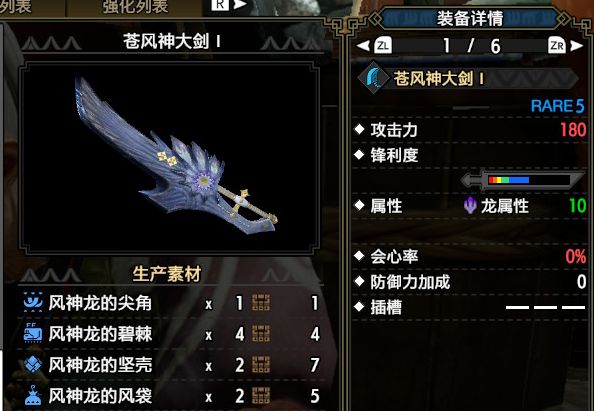 性能也和龙骨大剑一样渣渣,180攻绿斩放现在是肯定没前途的。就算龙属性在HR6能有所发挥也轮不到这玩意上。
