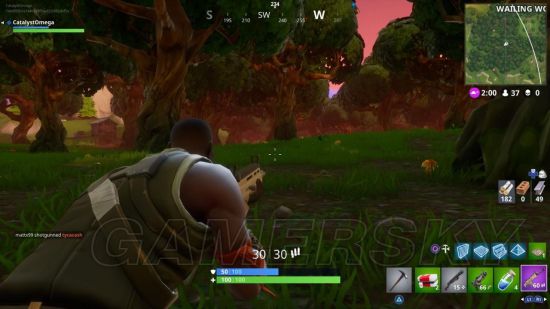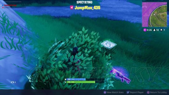 《堡垒之夜》的卡通画风意味着玩家的轮廓在很远的地方都非常显眼——尤其是加上在空地上奔跑时身后的一缕尘土。但是你能找到一些隐藏的绝佳地点,尤其在你能够善加利用的时候。尽管许多灌木是实心的,你还是能钻到一些灌木中去,能够基本隐藏你的角色,使你在远距离上很难被发现。