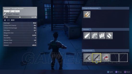 如果你没有玩过《堡垒之夜》守护家园模式可能不太清楚,但是不止有屏幕底部的小物品栏。你能够开启一个大得多且详细得多的物品栏菜单——如果你用的是手柄按方向“上”,如果用的是键盘按“I”键——里面列出了你携带的所有物品,包括每种型号的弹药量。物品栏菜单提供了枪械数据一览,包括有效射程和每秒伤害,能够帮助你决定取舍。物品栏还有其他便利的功能:提供了将武器丢弃到地面的选项。用它来将枪械、物品或弹药转给队友,或者用来整理物品栏,保证某种枪械始终在同一个物品栏位中。固定治疗或者某种武器的栏位能够使你在匆忙中切换更加自如。