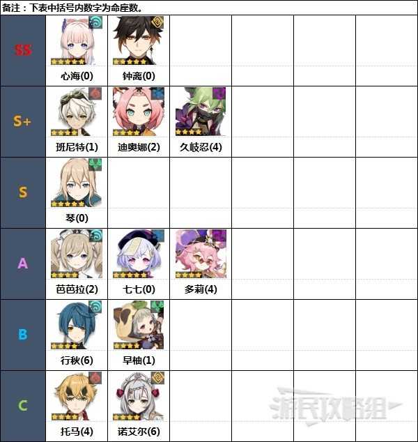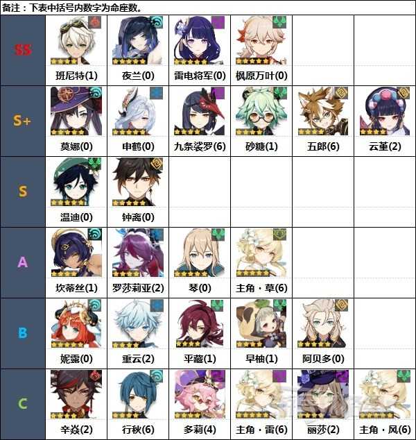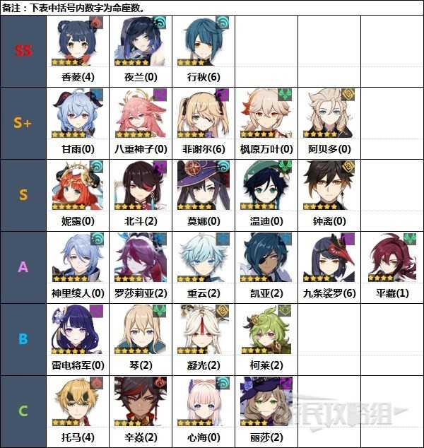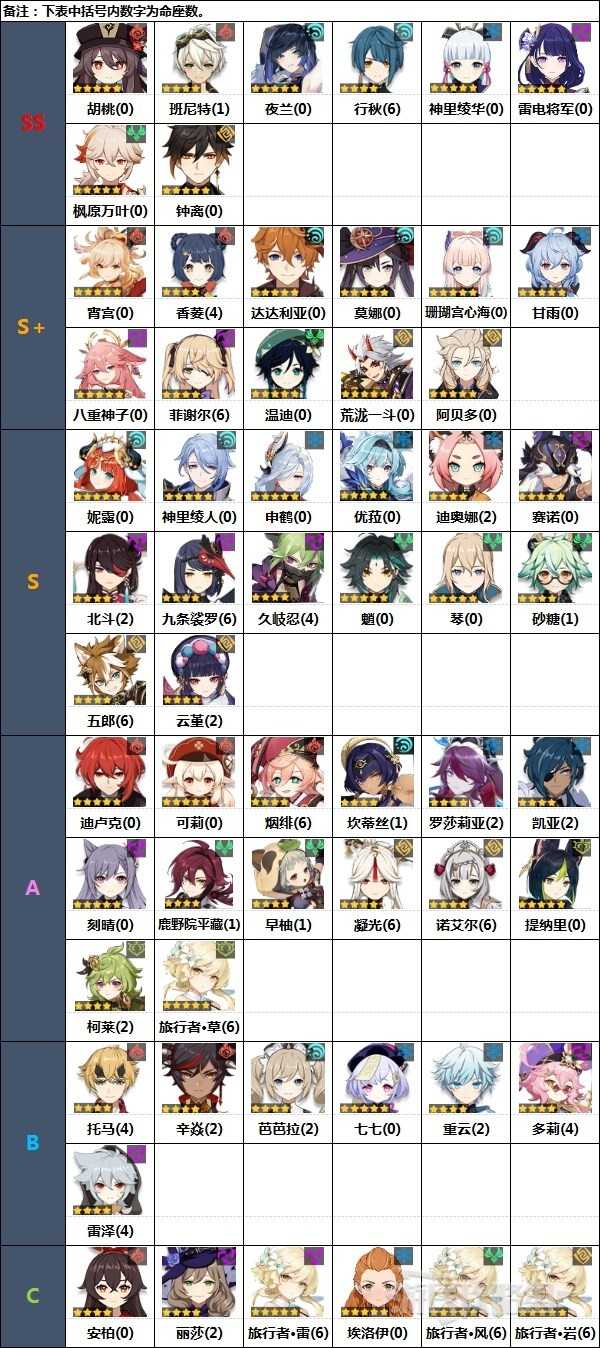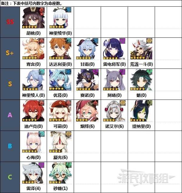 ※下方角色名后括号内数字为命座数,角色排名可能会受其他因素影响。