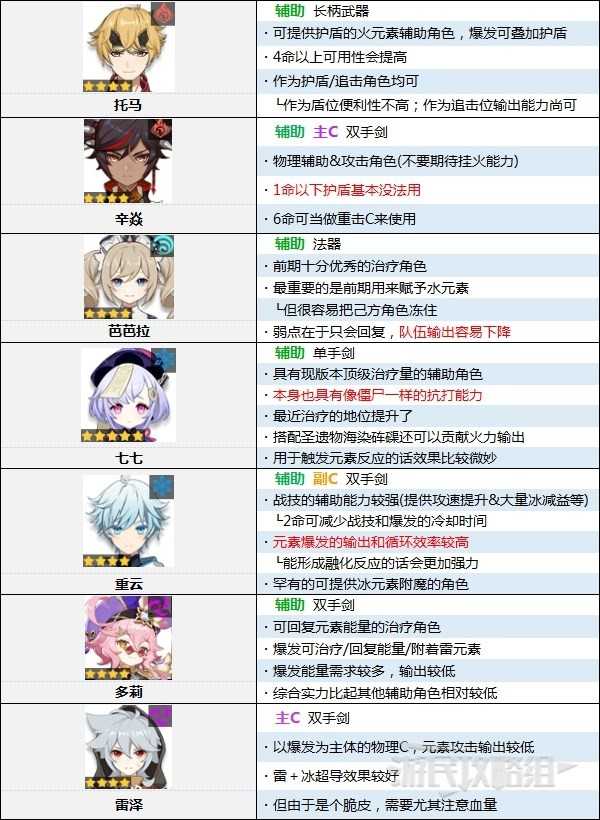 盾辅和治疗辅助主要指的是具有恢复血量和赋予护盾能力,能够从根本上提升友方角色生存能力的角色。越容易在战斗中保证队伍生存能力的角色评价越高。