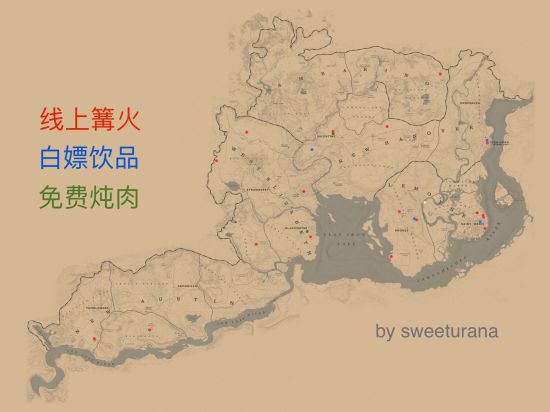 《荒野大镖客OL》游戏中玩家在线上模式的初期可能会需要一些补给品维持一天的消耗。可能玩家们在游戏刚开始时并没有那么多钱和时间去打理这些补给品。下面带来玩家“sweeturana”整理的《荒野大镖客OL》篝火及免费炖肉饮品位置分享。希望能为各位玩家带来一些帮助。