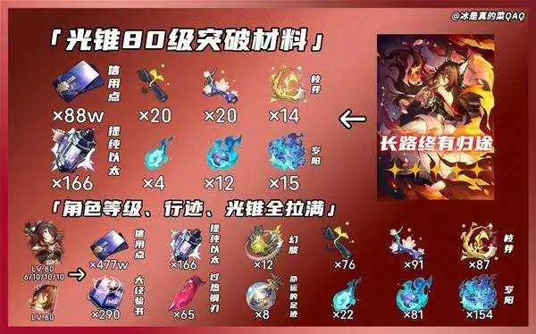 下图为忘归人80级行迹拉满材料和专属光锥「长路终有归途」80级材料!