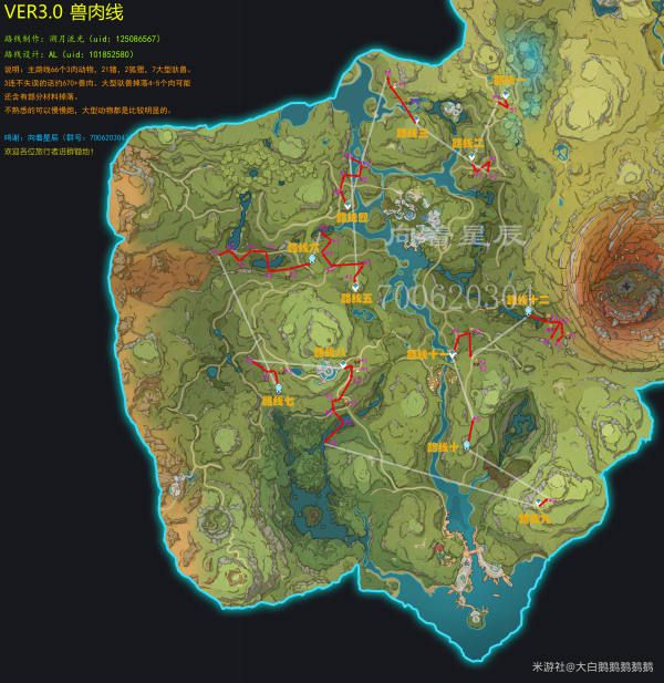 1、这是以须弥的三肉动物为主的路线,属于是“大型”兽肉路线,不占用2肉或者1肉路线的上限,故2.8攻略中的兽肉路线图仍可以使用。