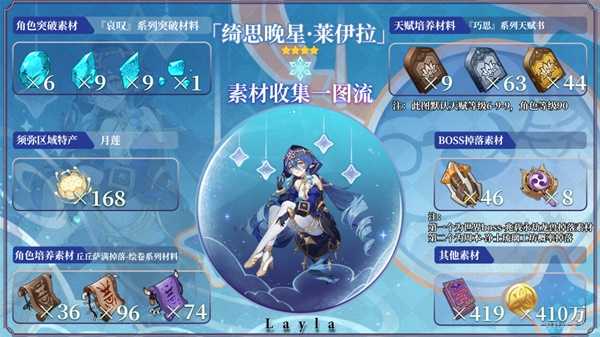 《原神》3.2版本下半期将上线新的角色——莱依拉。下面就为大家带来由“深海ai”分享的《原神》莱依拉培养材料收集攻略,希望对大家有用。