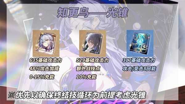 优先级:夜色流光溢彩>但战斗还未结束>轮契。一切以知更鸟终结技循环优先,攻击力堆再高,实战终结技覆盖率上不来也白费。
