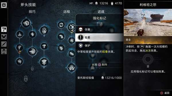 在进攻方面。首先,本作的技能树依然和武器绑定,玩家可在游戏中通过特定按键来施放的大多数‘招式’都是通过消耗经验值在武器技能树中解锁而来。在前作中,这些招式在解锁后还可以通过满足特定的属性值需求来进行进一步的强化。而在本作中,这个技能强化体系被替换了‘功绩’。只要在战斗中使用一定次数的该技能之后即可解锁进阶选项。这个调整让玩家在游戏早期就能对自己喜爱的战斗技能进行强化而不用必须等到后期高级装备的加持,算是个不错的改动。而在前作只有一种固定强化模式之上,本作中的强化模式变成了可随时修改的3选1(当然也要消耗经验值),这些强化中包含了直接伤害、元素特效积累、眩晕、元素伤害等等多种效果。而说到元素效果,这也是本作游戏所强调的一个特性。其一是战斗中可以按下三角键为武器提供一次元素充能,充能之后的轻击、重击和投掷都会产生一次特殊攻击。其二则是前作中对某种元素免疫的敌人(比如赫尔海姆的冰免僵尸)在本作中也变得更多,而相对元素的克制武器也增加了额外伤害。因此在本作尤其是高难度的战斗中,‘上debuff+切武器’也就变成了一个相当有用的操作技巧。熟练掌握后将会对战斗有很大的帮助。此外,通过在武器中镶嵌技能符文后按住L1加轻重击施放的‘符文技能’,以及为武器(包括盾牌)提供一个被动特效的‘配件’都依然存在。这也是游戏收集元素的一部分。随着游戏流程的推进。斯巴达之怒也会解锁更多功能比如消耗怒气恢复生命,或者提供一次单发高额伤害。总的来说,我认为本作游戏对战斗系统的调整使玩法体系更加清晰,玩家可以更快的熟悉系统并实现自己青睐的战斗风格。同时对元素效果的加强也让玩法更加丰富,无论是走武器伤害、元素伤害还是眩晕斩杀,游戏系统中都有足够的空间来让玩家发挥。整体玩法比前作更上了一层楼。