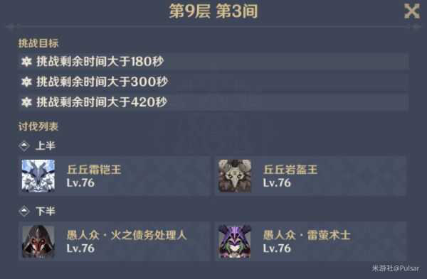 其中火最好有个安柏,如果10层之前的愚人众无法秒掉,则需要换个冰,不带雷是因为上层会面对雷史莱姆、雷骗骗花、雷咏者等,非常不友好。