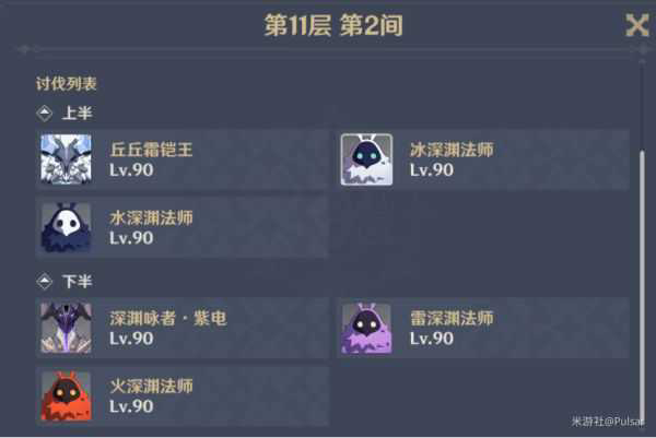 11-1丘丘雷兜王+雷深渊法师、11-2、深渊咏者紫电+雷火深渊术士、11-3无相火