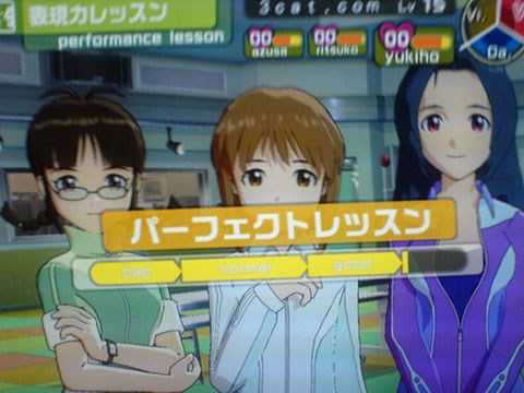 | 在游戏中,每一周只能选择一种课程(而且随机会出现因为课程馆休息的缘故而有1-3种课程无法参加的事件),每次课程有6次机会,根据你玩小游戏的准确性以及速度一共分成Rank A、 B、 C、 D、 E五种等级(等级越好下面的成绩槽参加的越多)以及"BAD","BAD"的话不增加下面的成绩槽,6次机会全部完成后统计成绩,有"bad"、"noraml"、"good"三种,其实"good"后面还有一处空白,是"perfect",最后成绩越高增加能力越多。而且有时候课程进行完后会出现BONUS课程,可以再进行一次课程选择,而如果tension高的情况下,偶尔会发生偶像偷懒的情况,就是6次机会只用了5次就结束了,当然同样的,tension低的时候也会发生偶像要求追加练习的事件,可以多出2次机会 |