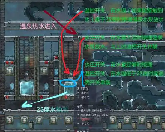 红箭头所指的开关用来控制抽温泉水的水泵,蓝圈所圈的开关用来控制抽冷却水的水泵