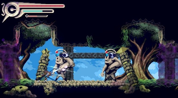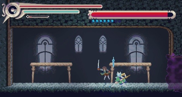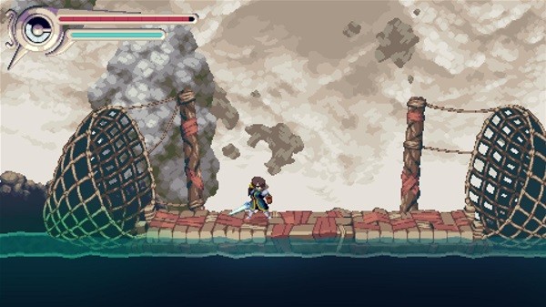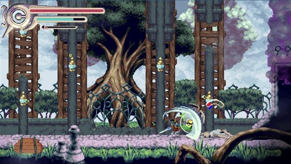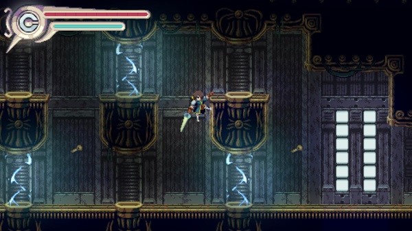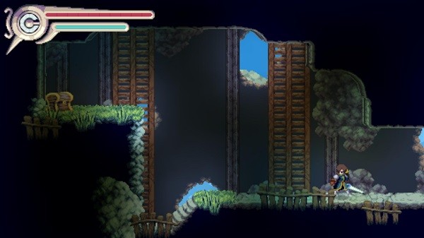 对于我这个战狂类恶魔城爱好者来说,《vernal edge》的战斗显然是不太够打了,事实上本作的重心大概是在于跳跳乐,还是玩出了挺多的花样,比如弹簧、能抓握的绳子&滑索、会把玩家冲掉的水流等等。