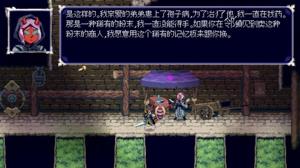 其次是本作包含了比较多的类似于2D格斗的战斗设定,包括挨打没有无敌时间,但是有蓄力重击破盾、有受身设定,有下+攻击 = 滑铲这种兼具攻击+换位的设定、有击飞和撞墙弹飞设定、可以空连等等,本作的这些战斗用被动技能被称为“记忆”,在游戏过程中可以不断的收集记忆格子,并且在商人处购买新的战斗记忆,可以获得空中防御之类的能力(格斗体验就更强了)。
