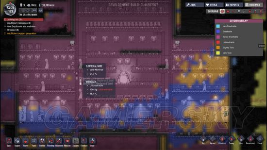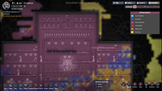 上一张我新建了制氧器后的氢气爆炸图,原因我还不知道,回到未新建制氧器前存档,保持原样,目前正常工作。不过由于污染空气净化也需要沙子,所以污染空气无法消除,由于我的基地是封闭的,搞不清污染空气的产生源头是什么,目前只能观望。