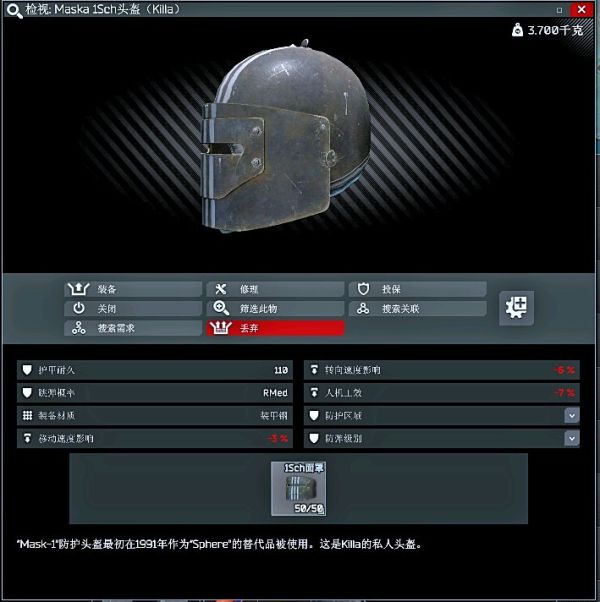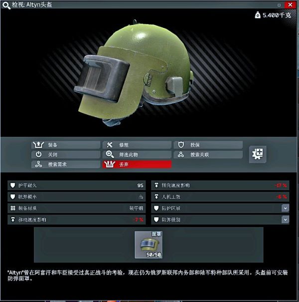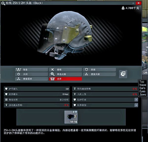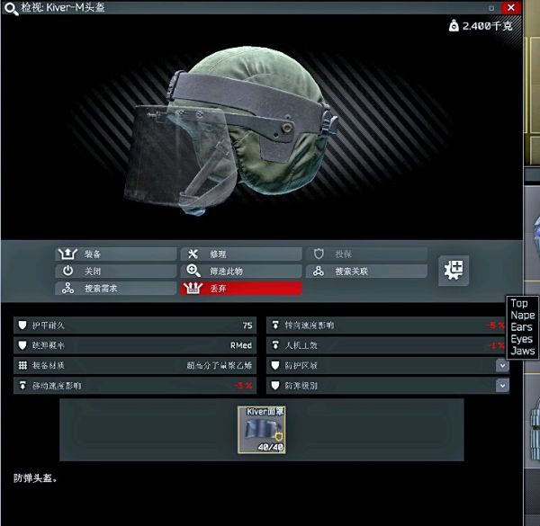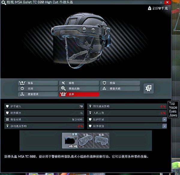killa酱专属头盔,自闭头,整个游戏最厚的脸,放下面罩后视野只剩一条缝。