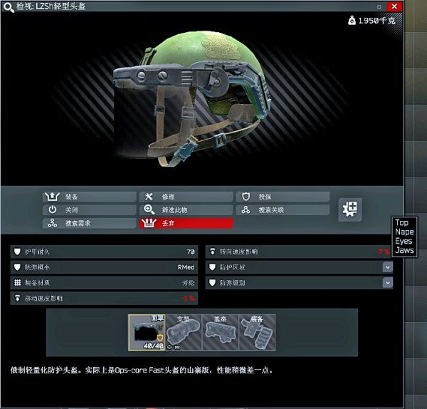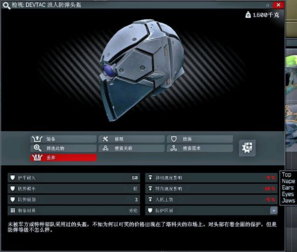 唯一一个一点视野都不挡的全防护头,唯一一个不能带耳机但是也不是自闭头的头。没啥实用性,但是因为比较特殊拿出来说一下。
