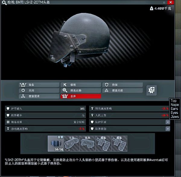 属性:全位置高级跳弹4级防护(装备组件里还有一个高级跳弹的5级护颈,但是防护位置尴尬属性也不好,所以没有算在内)