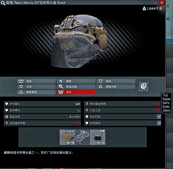 属性:全位置3级防护,头耳颈中等跳弹,眼颚高级跳弹。